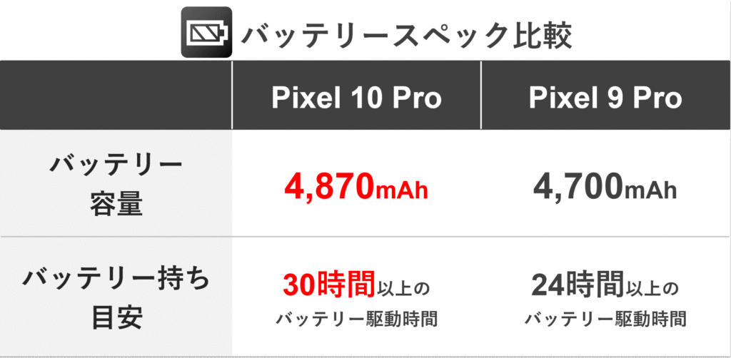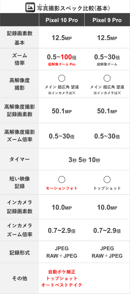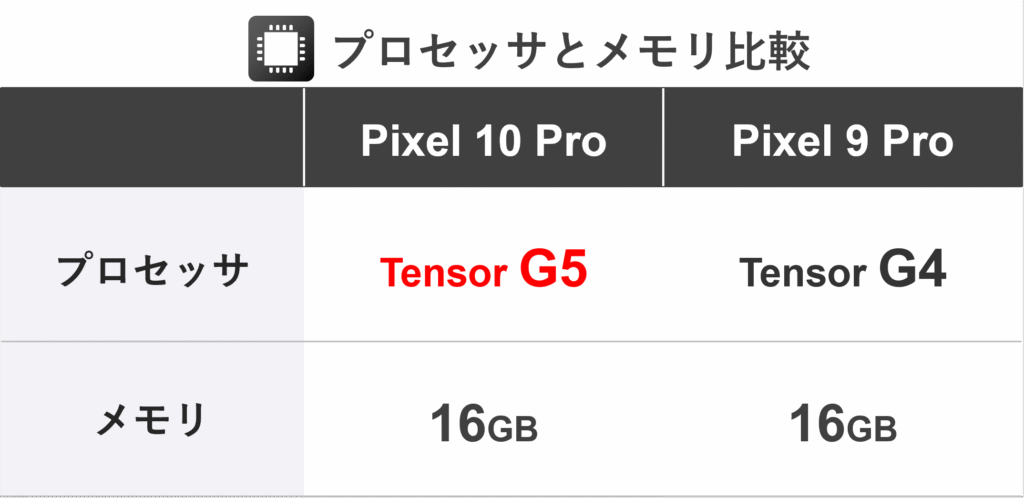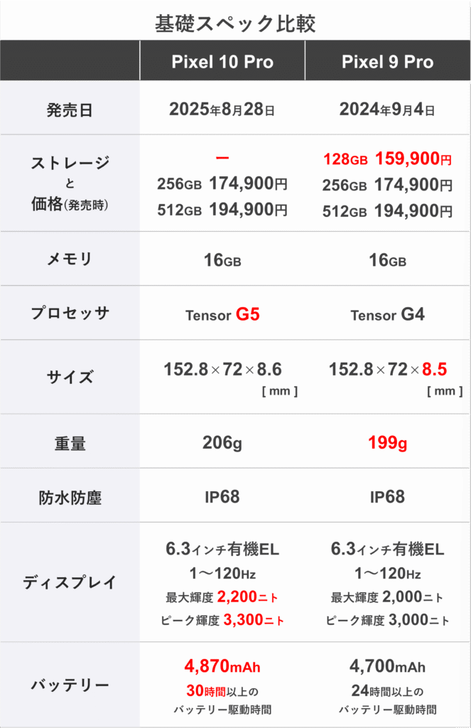 Pixel 10 ProとPixel 9 Proの主要スペックは以下です。(※参照元 Google公式サイト)