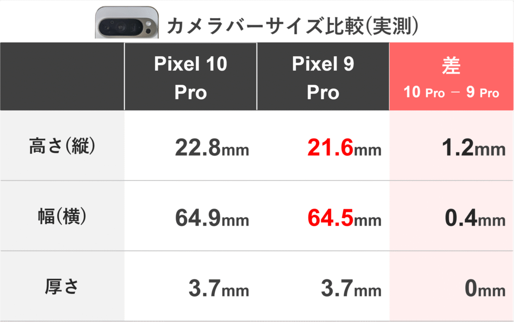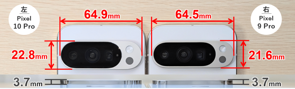 Pixelシリーズの象徴であるカメラバーは、Pixel 10 Proのほうがわずかに大きくなっています(出っ張りの厚さは同じ)。