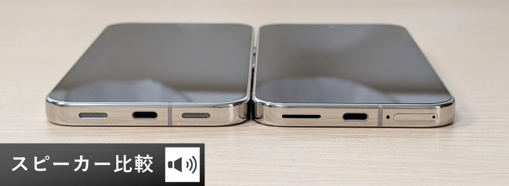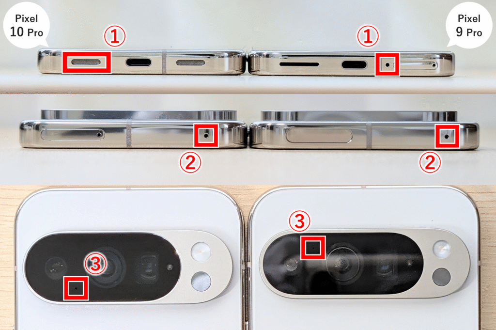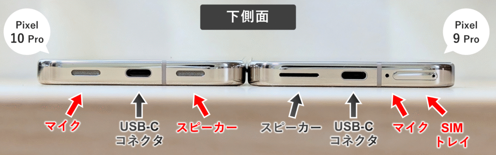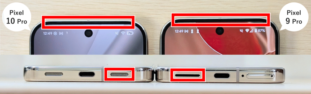両機種ともにステレオスピーカーです。Pixel 10 ProはPixel 9 Proと比べ、下側面のスピーカー位置が左右入れ替わっています。