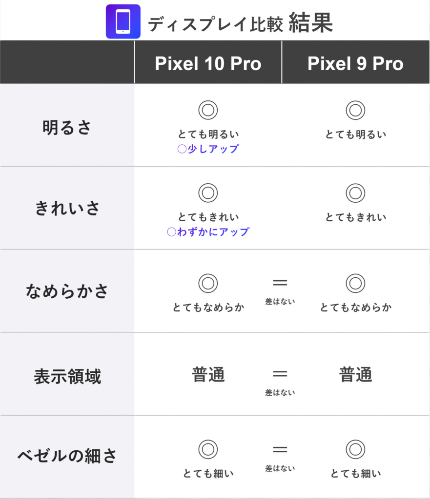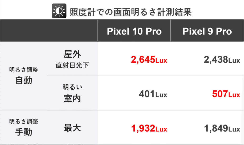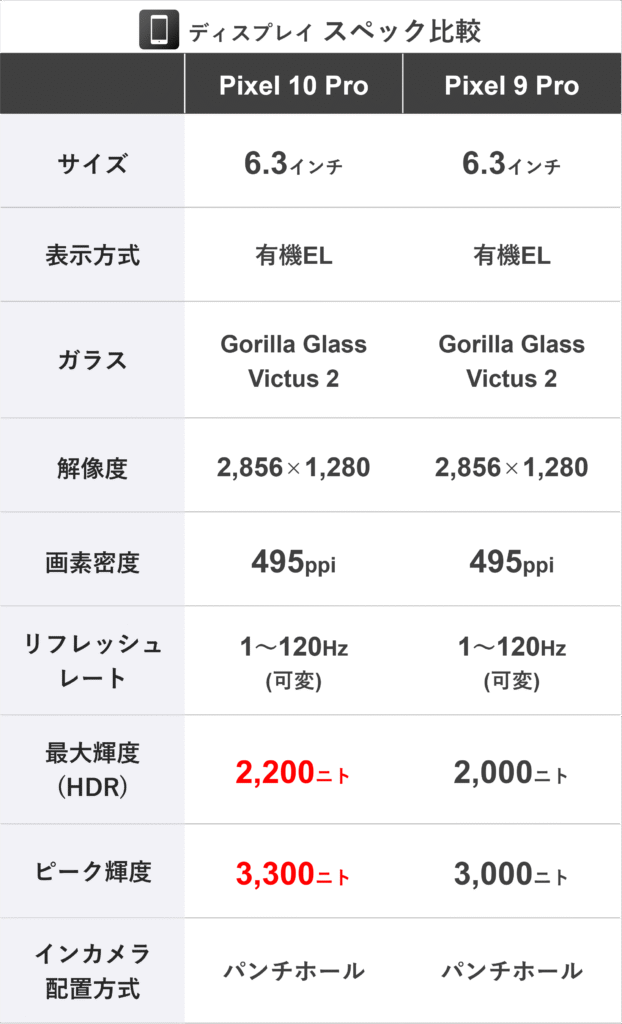 スペック比較│Pixel 10 Proは輝度が10%上がった