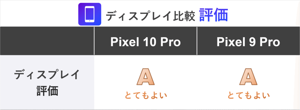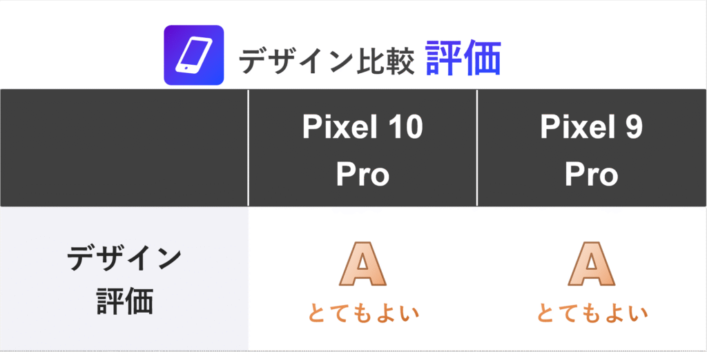 Pixel 10 ProとPixel 9 Proのデザインは、カメラバーのサイズなどのわずかな違いを除けば、ほぼ同じであるため、評価も同じく「A(とてもよい)」評価です。