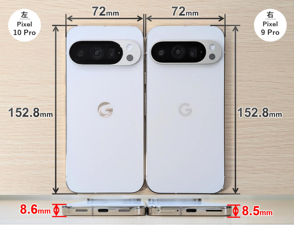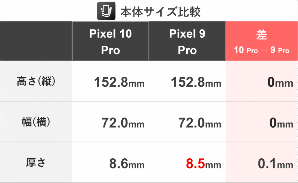 Pixel 10 Proは高さ・幅はPixel 9 proと同じですが、厚さが0.1mm増加しています。