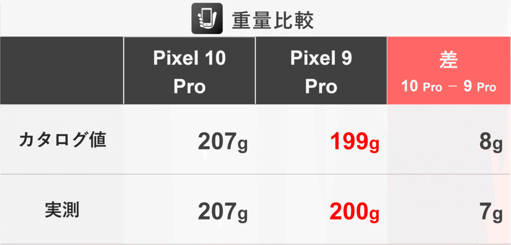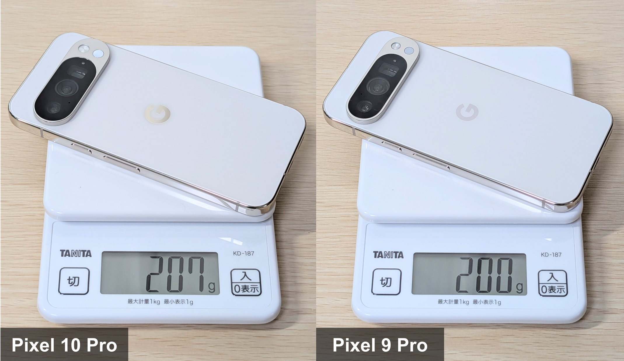 実際手で持つと違いはわかります。Pixel 10 Proはやっぱり少し重い。