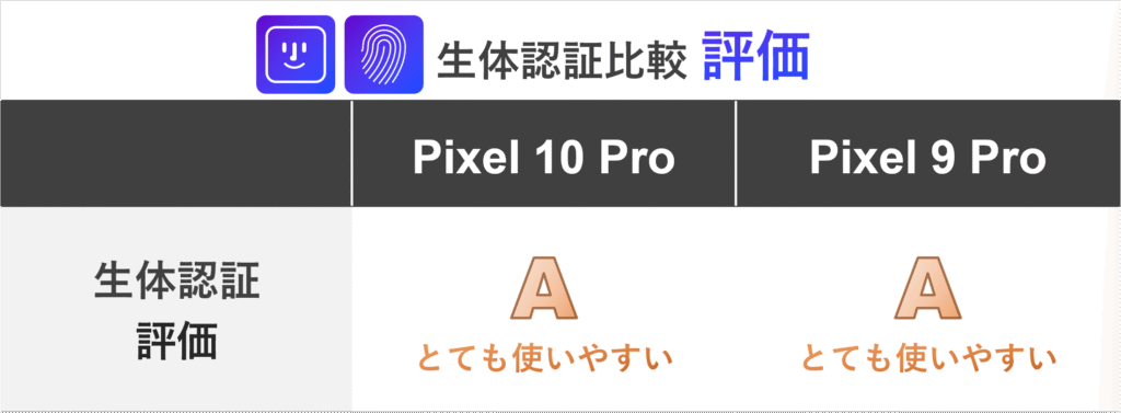両機種の生体認証に差はありません。評価は「A(とても使いやすい)」です。