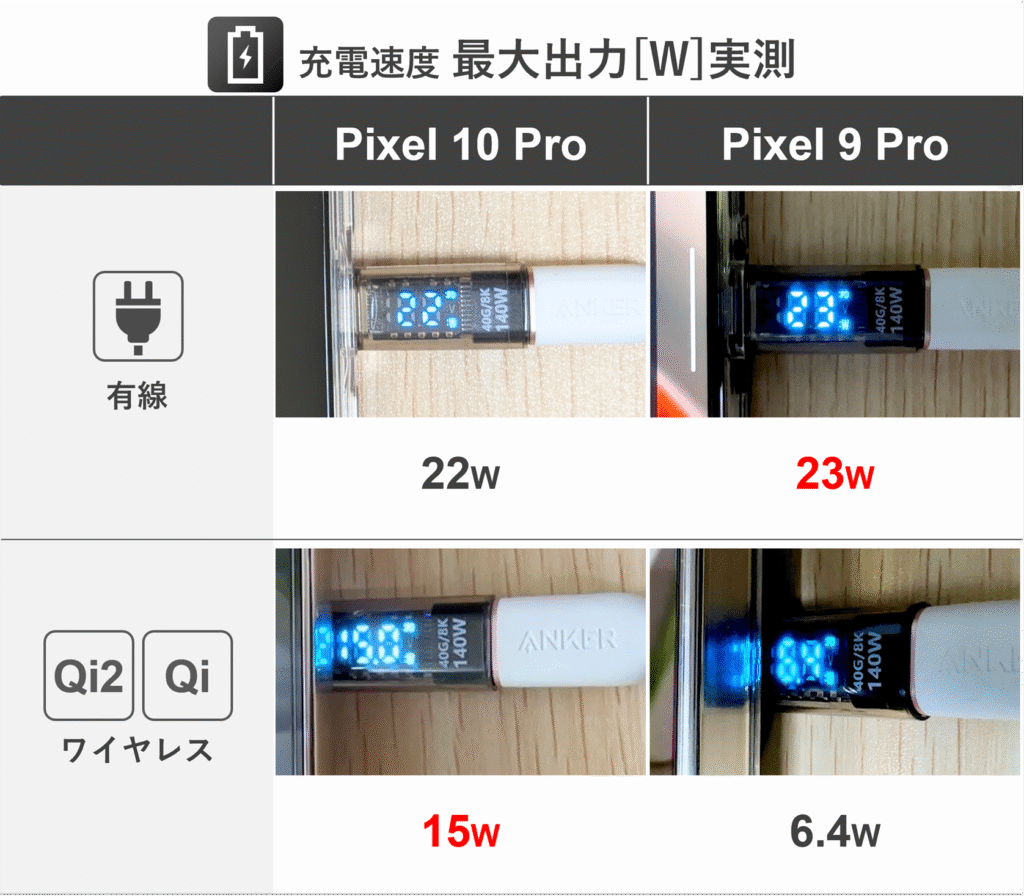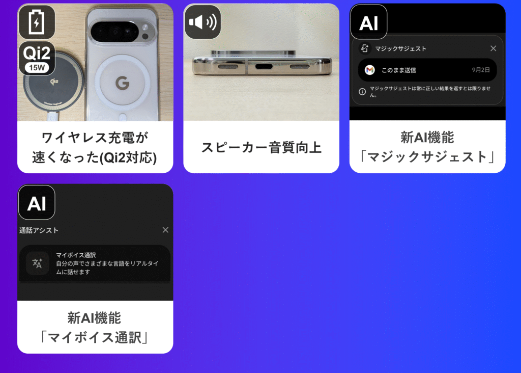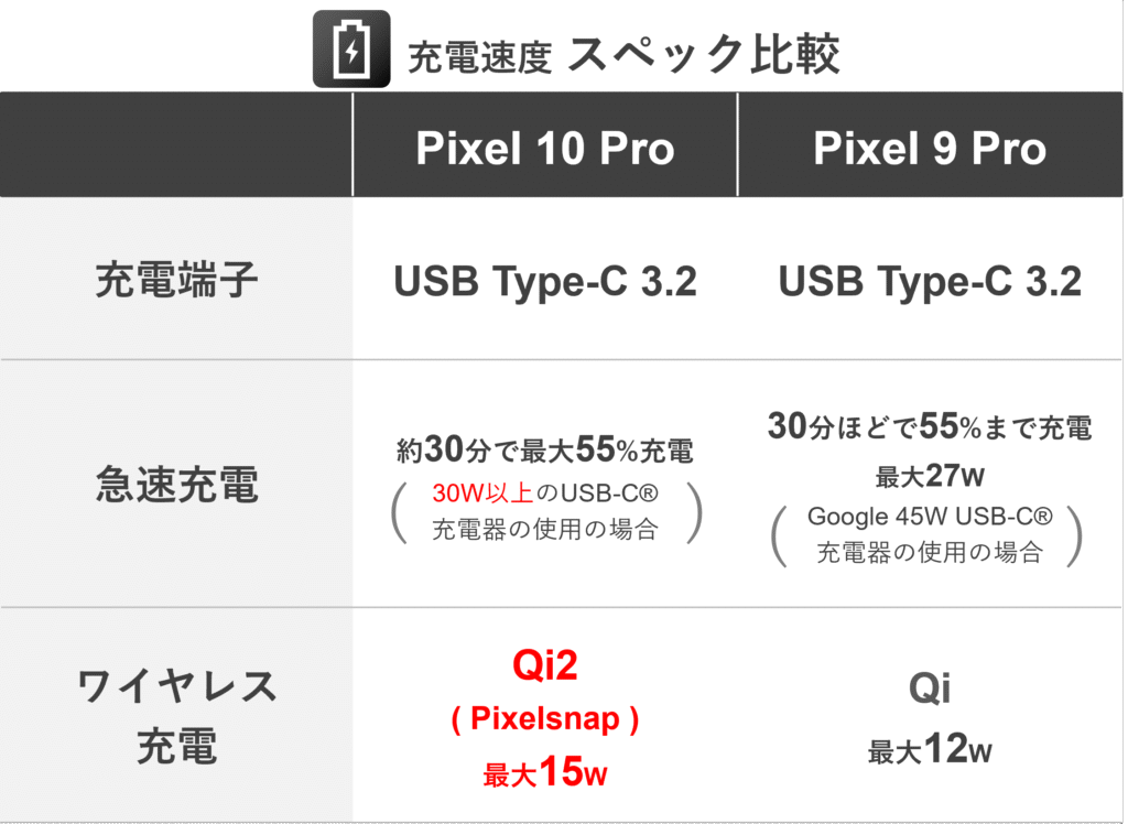 Pixel 10 ProがPixel 9 Proから進化した点は、主に「スピーカー音質」と「ワイヤレス充電速度」で、他はごくわずかな差です。