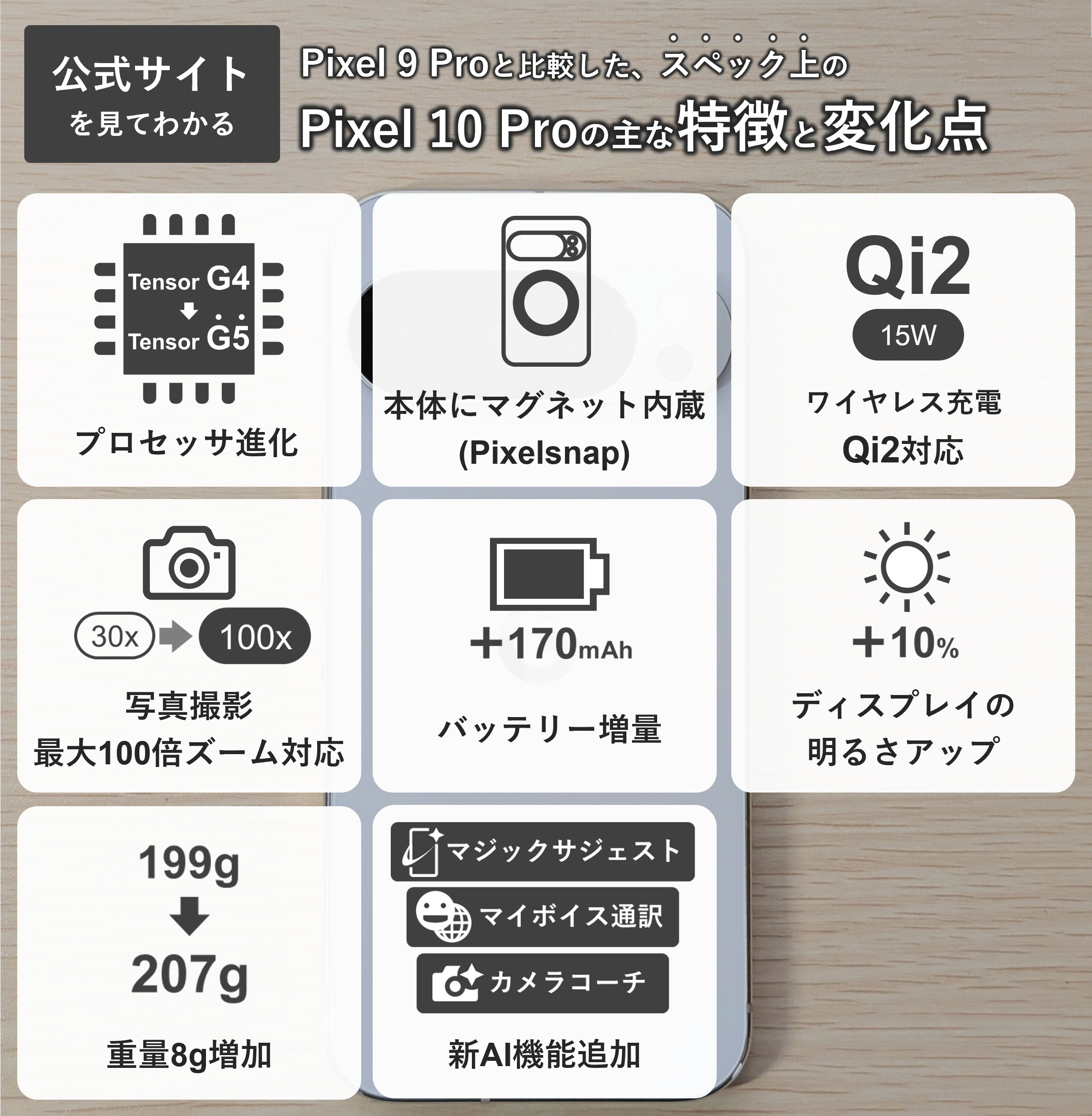 スペック上のPixel 10 Proの主な進化点は、プロセッサ、バッテリー容量、ディスプレイ輝度、ワイヤレス充電のQi2対応、写真撮影のズーム倍率になります。