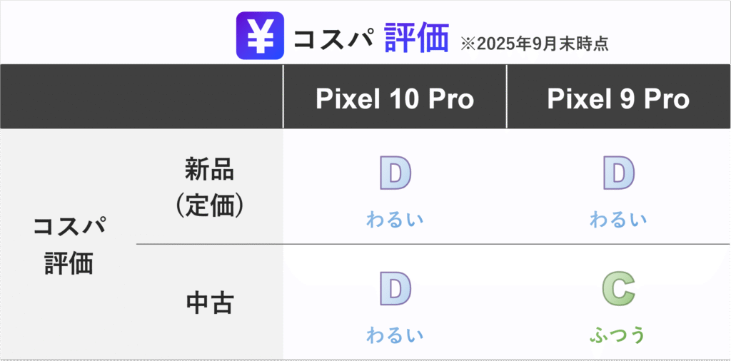 【コスパ評価】Pixel 10 Proは「悪い」。中古のPixel 9 Proは「ふつう」