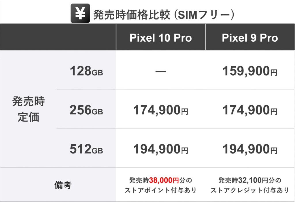 発売当初の定価は両機種同じです。ただし、Pixel 10 Proには128GBモデルがなく、最低価格が上がっています。