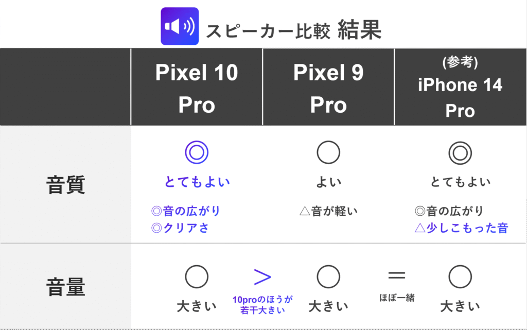 iPhone 14 Proと比較すると、Pixel 10 Proのほうが良いと感じました。Pixel 10 Proのほうが音に迫力があり、広がりも良く、クリアな音に感じられます。