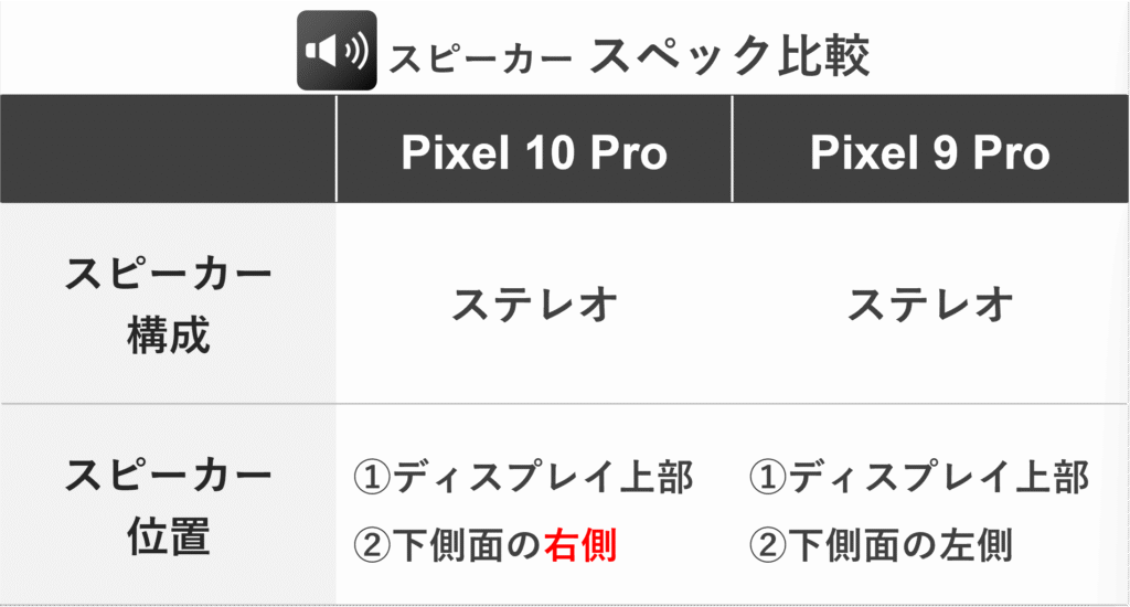Pixel 10 Proのスピーカーについて、Google Japan BlogのPixel 10 Proの記事ではスピーカーを強化した旨が記載されており、性能向上が期待できます。