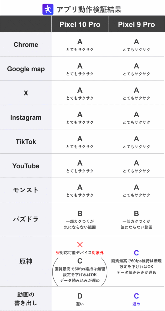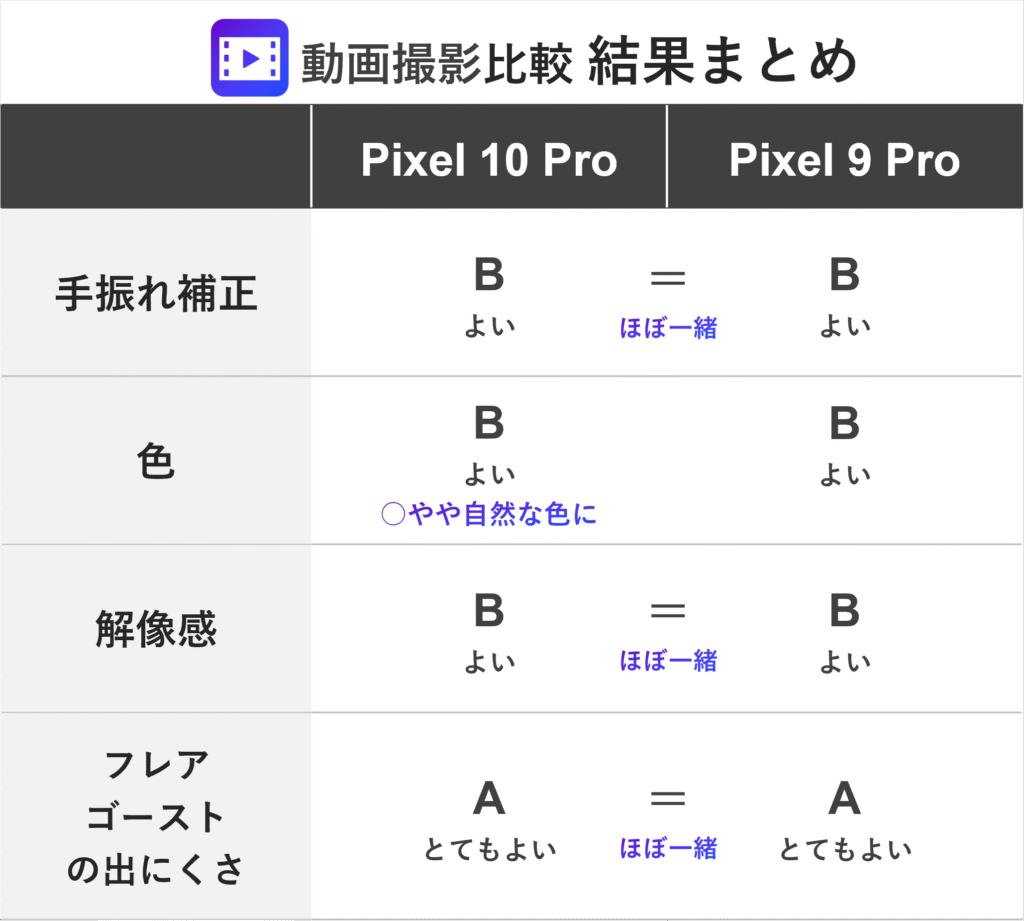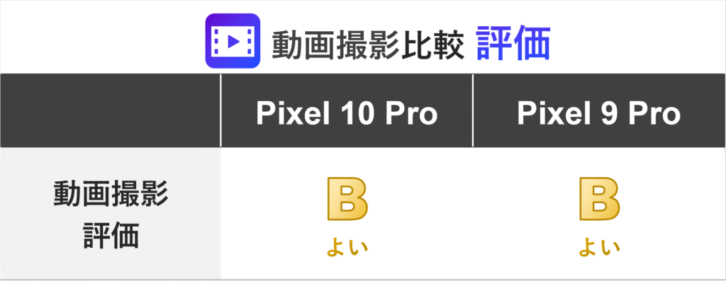 ぼくはiPhone 14 Proよりも良いと感じたため、Pixel 10 Proは「A (とてもよい)」にしました。