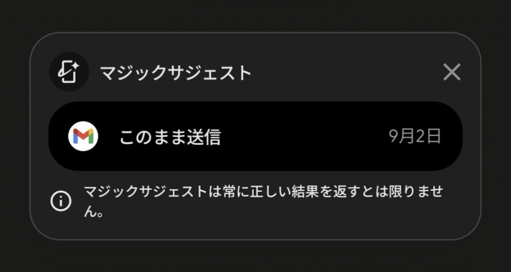 ぼくはPixel 10 Proを1ヶ月間使っていますが、「マジックサジェスト」はまだ1回しか機能していません。通話開始時にメールを送信するか提案してくれました。