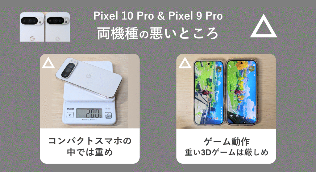 - Pixel 9 Proのほうが持ちやすく、操作しやすい。Pixel 10 Proは207gで重い。