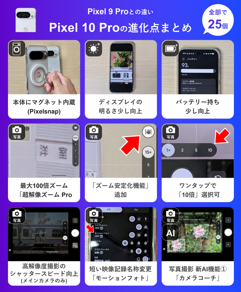 - Pixel 10 ProがPixel 9 Proから進化した点は全部で25個。