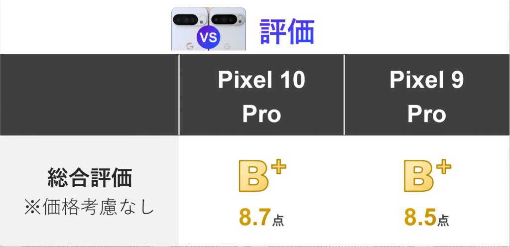 総合評価は両機種とも「B⁺」。ただし細かい点が進化しているため、Pixel 10 Proは8.7点としました。