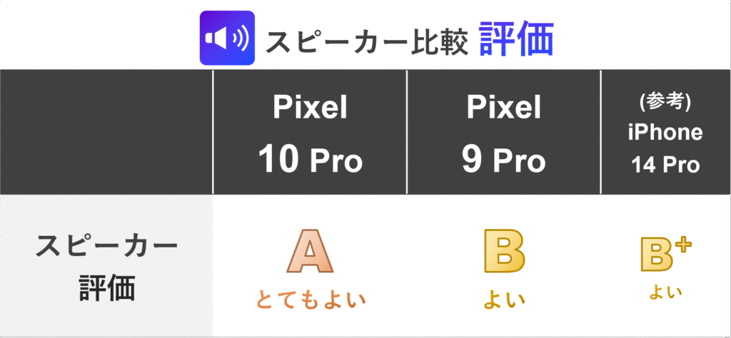 スピーカー比較 評価│Pixel 10 Proは「A」に